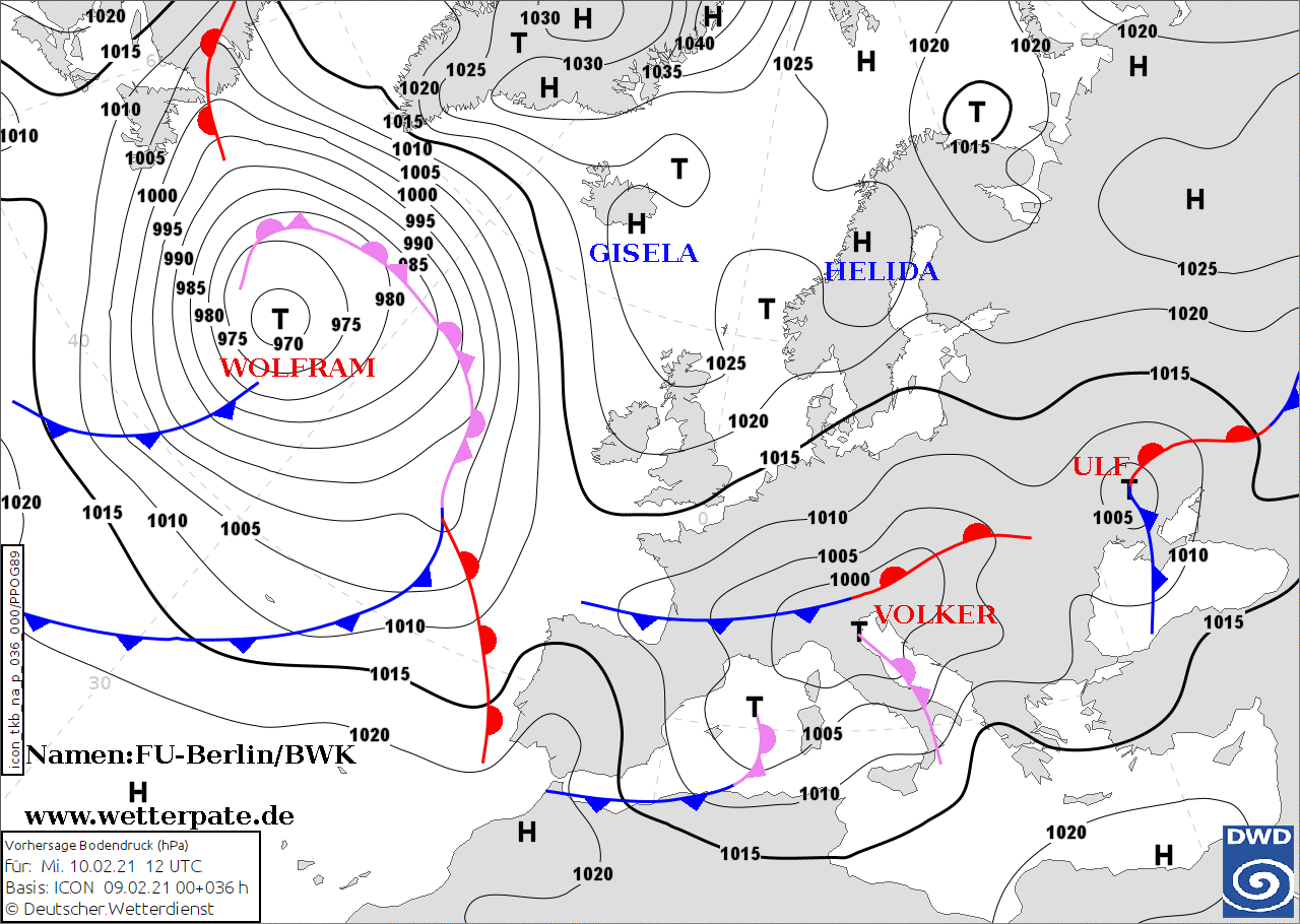 Noms des dépressions et anticyclones prévus pour mercredi 10 février 2021 à midi (Berlin)