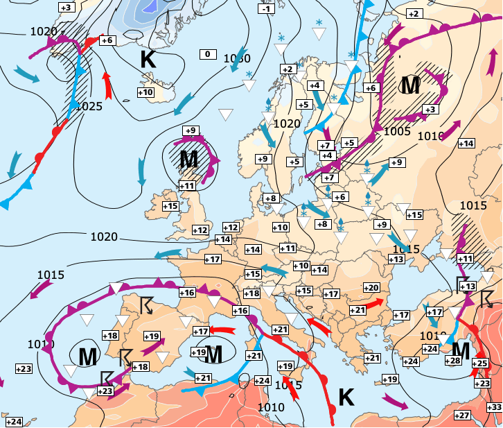 + Le vaste anticyclone qui étendait son influence sur une bonne partie de l'Europe occidentale laisse place à une vaste dépression centrée sur le Sud-est de la France.