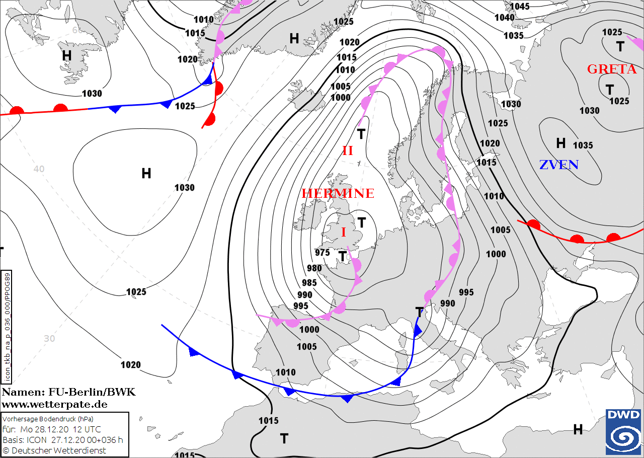 Noms des dépressions et anticyclones prévus pour lundi 28 décembre 2020 à midi (Berlin)