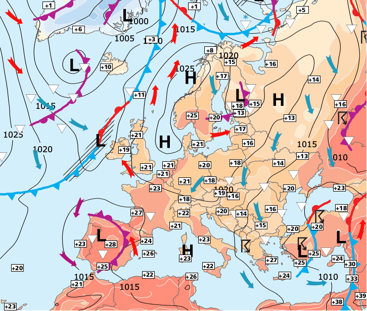 + Le vaste anticyclone qui recouvre une bonne partie de l’Europe se décalera peu à peu vers la Scandinavie dans les prochains jours.