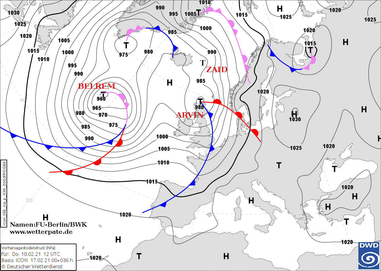 Noms des dépressions et anticyclones prévus pour jeudi 18 février 2021 à midi (Berlin)