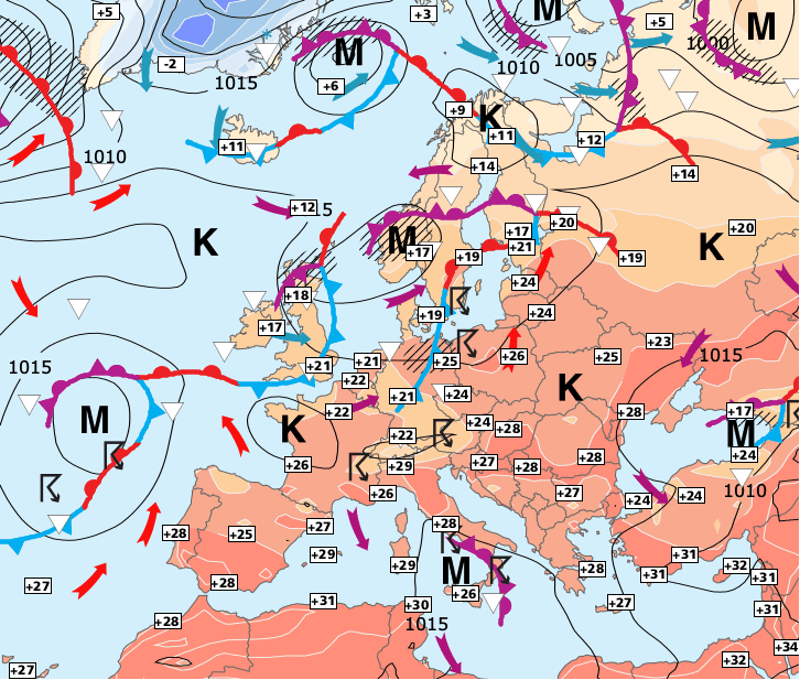 + Avec le retour de l’anticyclone le temps est plus stable, mais comme les hautes pressions sont centrées sur la Bretagne, l'influence reste légèrement océanique sur la moitié Nord de la France (d'où un samedi un peu plus nuageux que prévu, en lien avec la chaleur de la journée et l’humidité maritime).