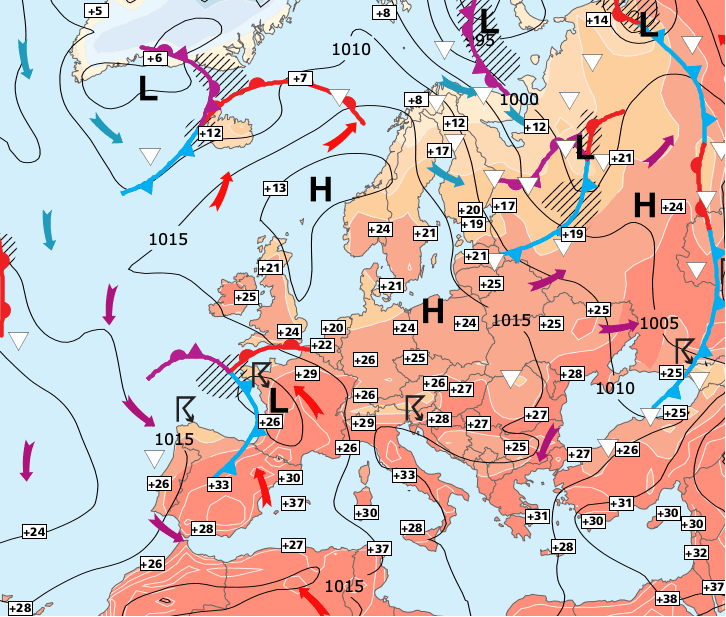 Noms des dépressions et anticyclones prévus pour vendredi 23 juillet 2021 à midi (Berlin)