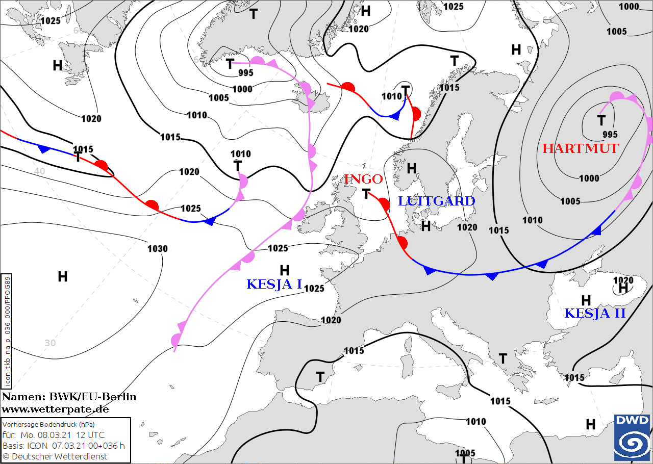 Noms des dépressions et anticyclones prévus pour lundi 8 mars 2021 à midi (Berlin)