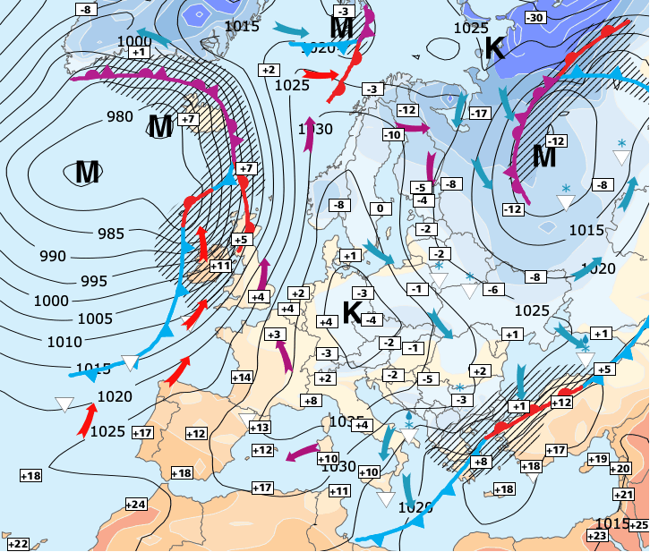 + Dans un premier temps des perturbations pluvieuses de faible activité balayeront le Nord de la France avec un temps assez maussade et humide mais aussi plus doux.