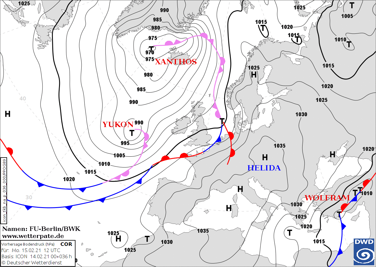 Noms des dépressions et anticyclones prévus pour lundi 15 février 2021 à midi (Berlin)