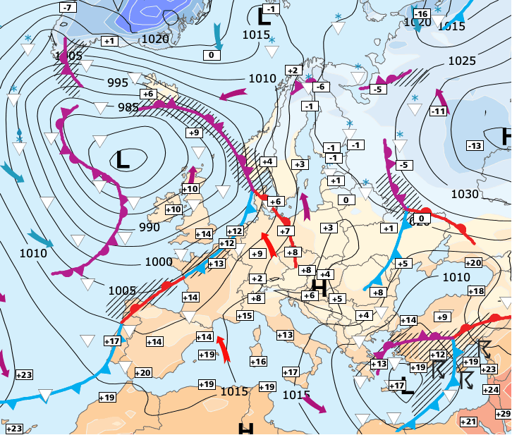 + Nous sommes désormais situés entre l'influence de l'anticyclone d'Europe continentale et d'un vaste système dépressionnaire centré dans les parages des Iles britanniques.
