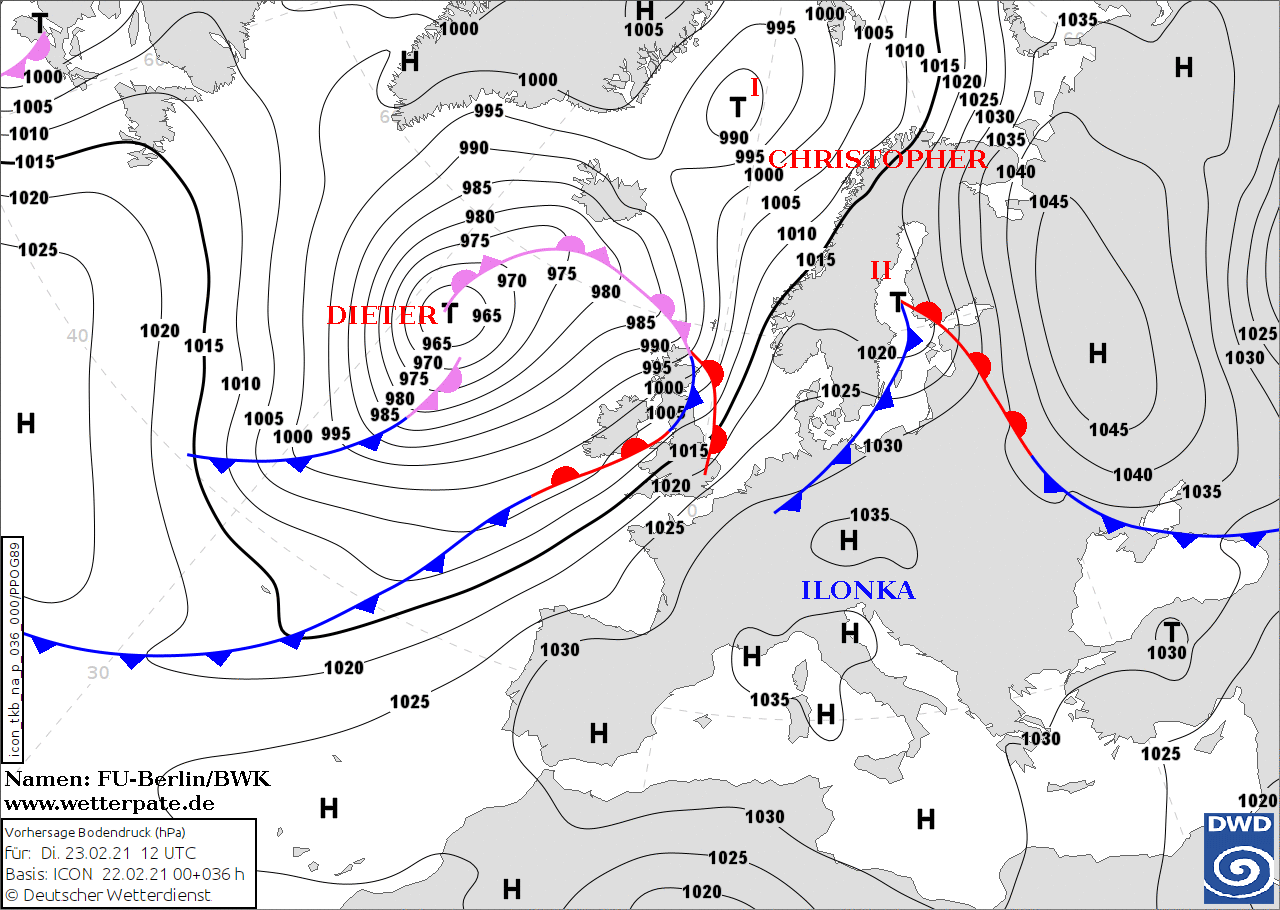 Noms des dépressions et anticyclones prévus pour mardi 23 février 2021 à midi (Berlin)
