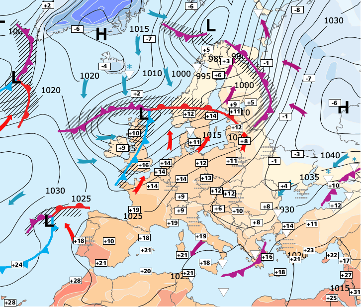 + Jeudi, un front froid traversera la France du nord-ouest vers le sud-est. Il sera accompagné de quelques précipitations et surtout d'une baisse sensible des températures (en liaison avec la descente polaire qui envahira toute la partie occidentale de l'Europe).