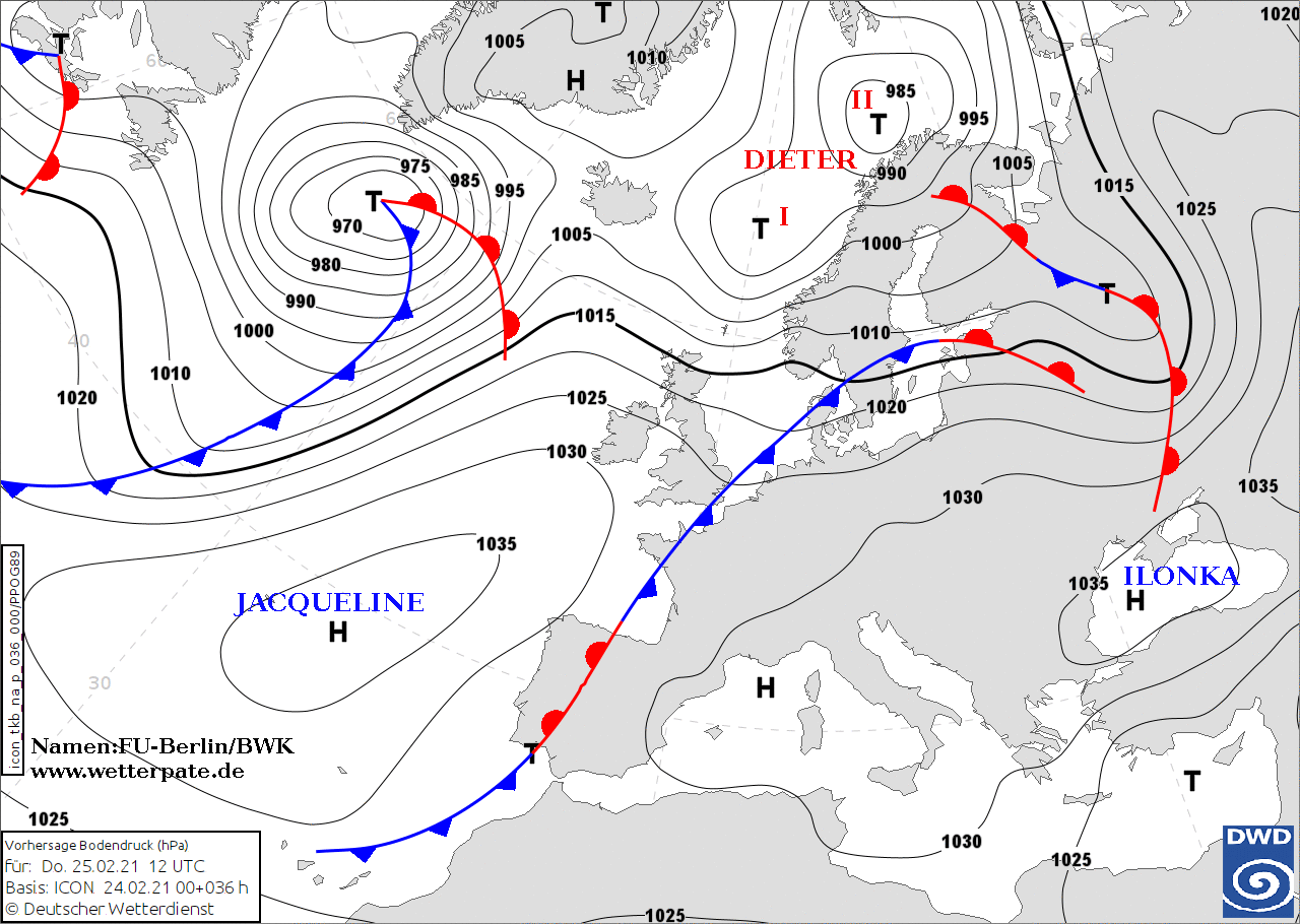 Noms des dépressions et anticyclones prévus pour jeudi 25 février 2021 à midi (Berlin)